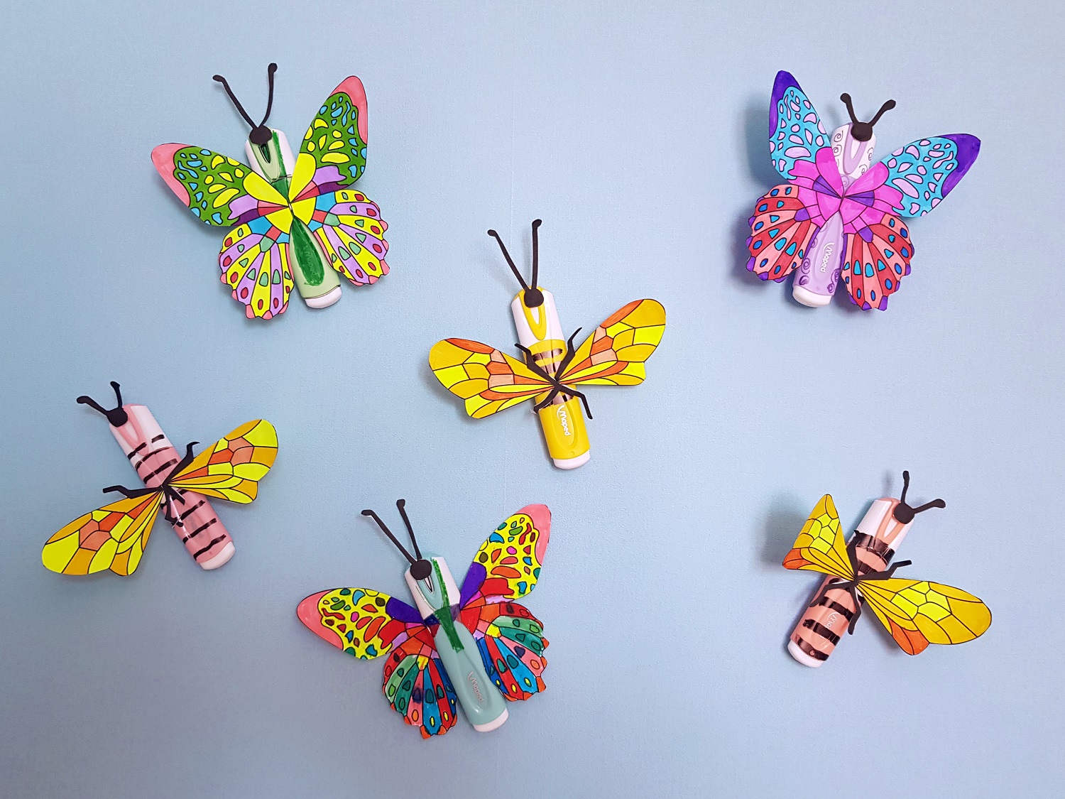 Añade una pequeña bola de plastilina detrás de los marcadores y pega las mariposas y las abejas en una pared, un mueble o una puerta. ¡Felicitaciones por esta hermosa decoración de verano!