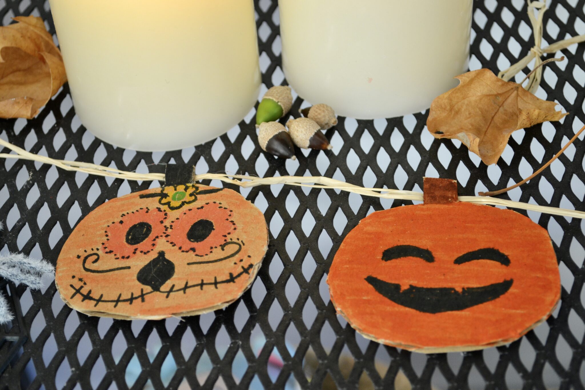 Utiliza tus cajas de cartón para hacer una decoración de Halloween: ¡una guirnalda de calabazas! Un poco de cuerda, unos lápices de colores, un poco de imaginación y ¡listo!